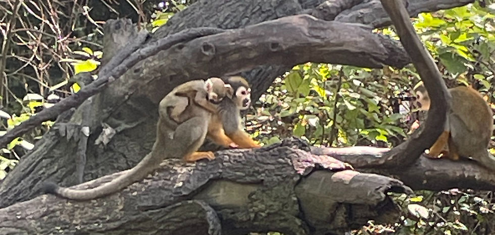 This past year, I was lucky enough to see baby monkeys - squirrel monkeys in the Children's Zoo (at the Bronx Zoo) and a new silvered langur (who starts life a bright orange). Watching a troop of monkeys playing is such a joyful experience, I feel honored to have seen these new babies! Look carefully to see the baby squirrel monkey clinging to its mama's back.